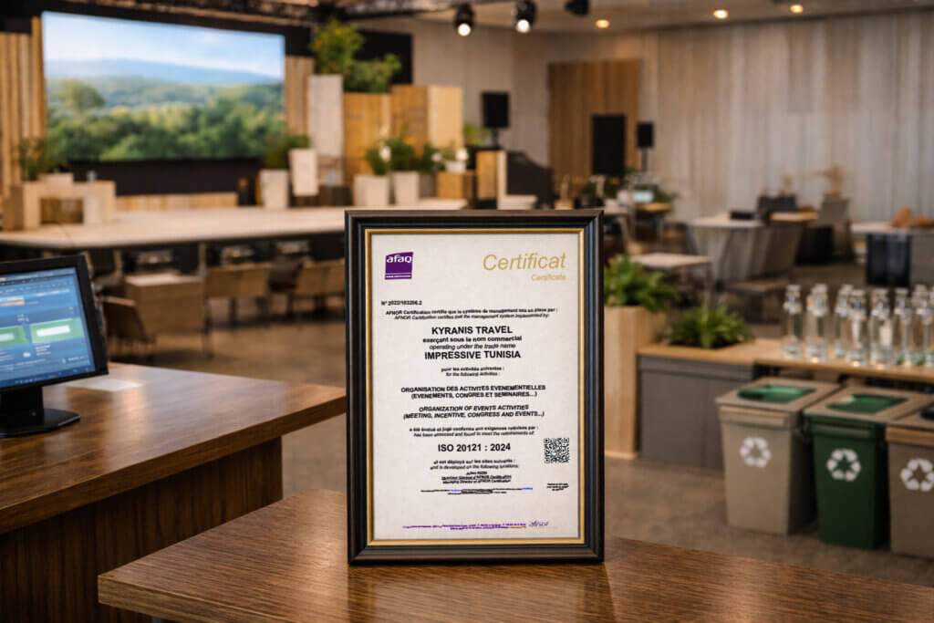 As the only event agency certified ISO 20121:2024 in Tunisia and the MENA region, and among a small number of DMCs worldwide validated by AFNOR, we no longer offer basic logistics.